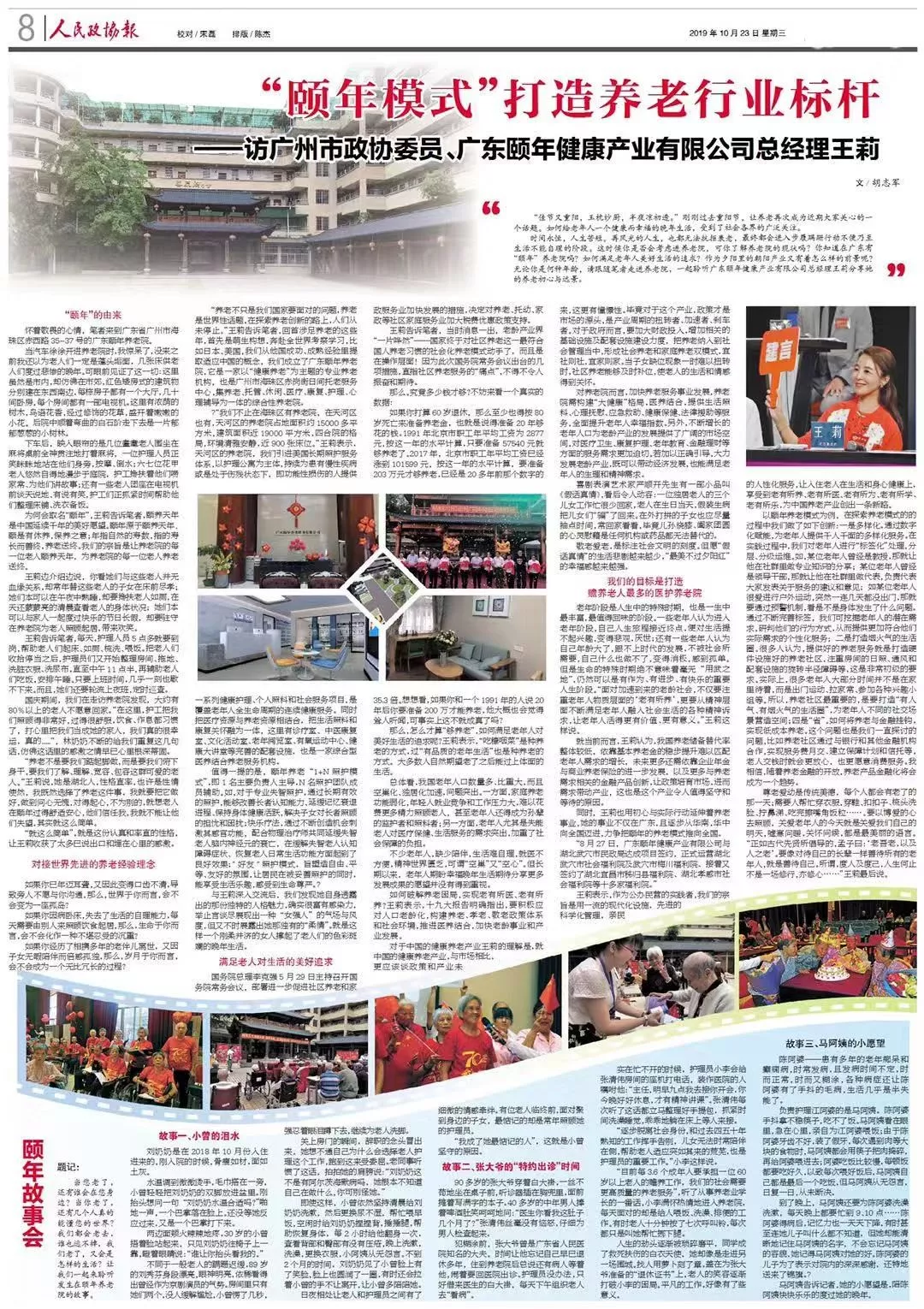 2019年10月23日,《人民政協(xié)報》媒體整版刊登《“頤年模式”打造養(yǎng)老行業(yè)標(biāo)桿——訪廣州市政協(xié)委員、廣東頤年健康產(chǎn)業(yè)有限公司總經(jīng)理王莉》,權(quán)威解讀頤年養(yǎng)老院的獨特養(yǎng)老模式!